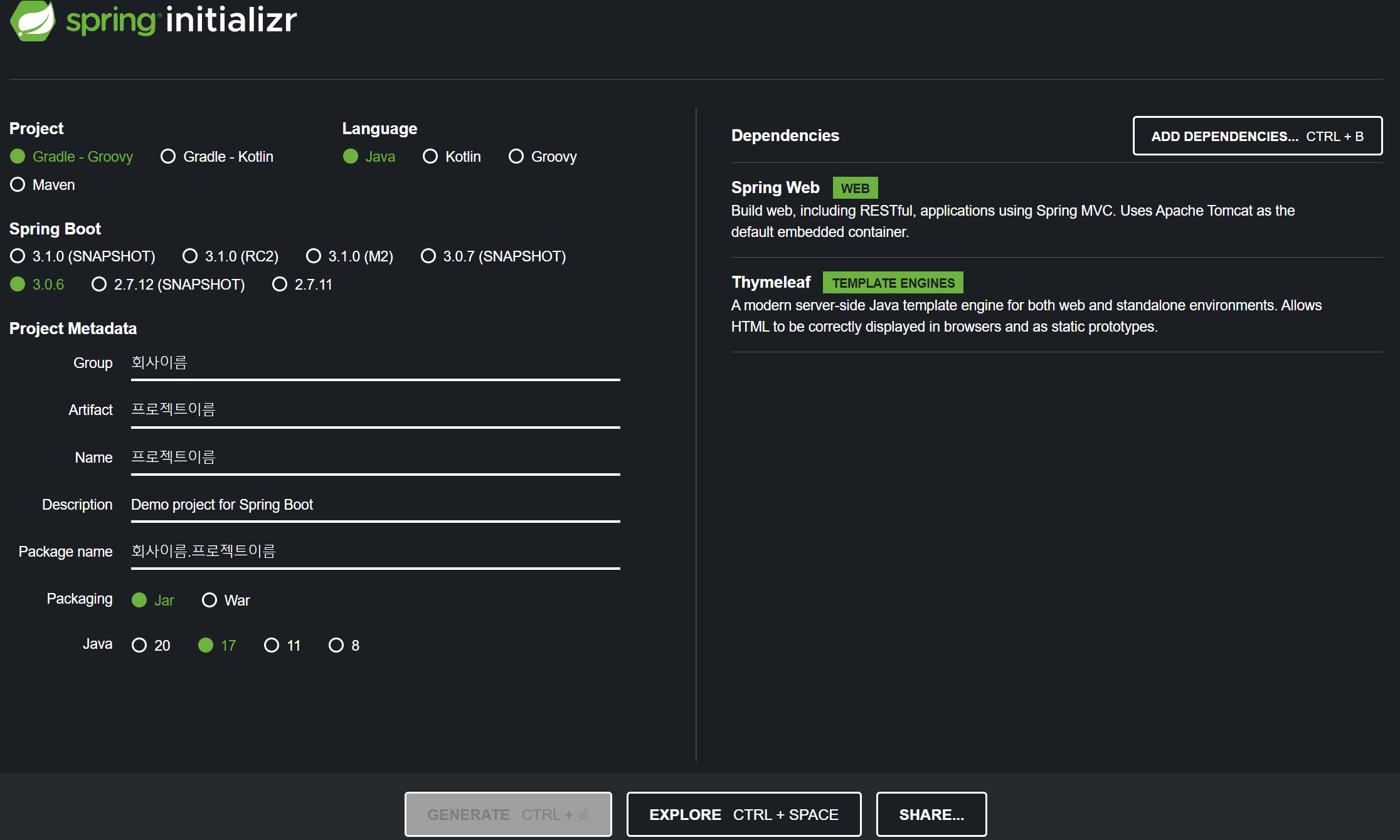 저는 ADD DEPENDNCIES에서 spring web, Thymeleaf를 불러온 상태입니다