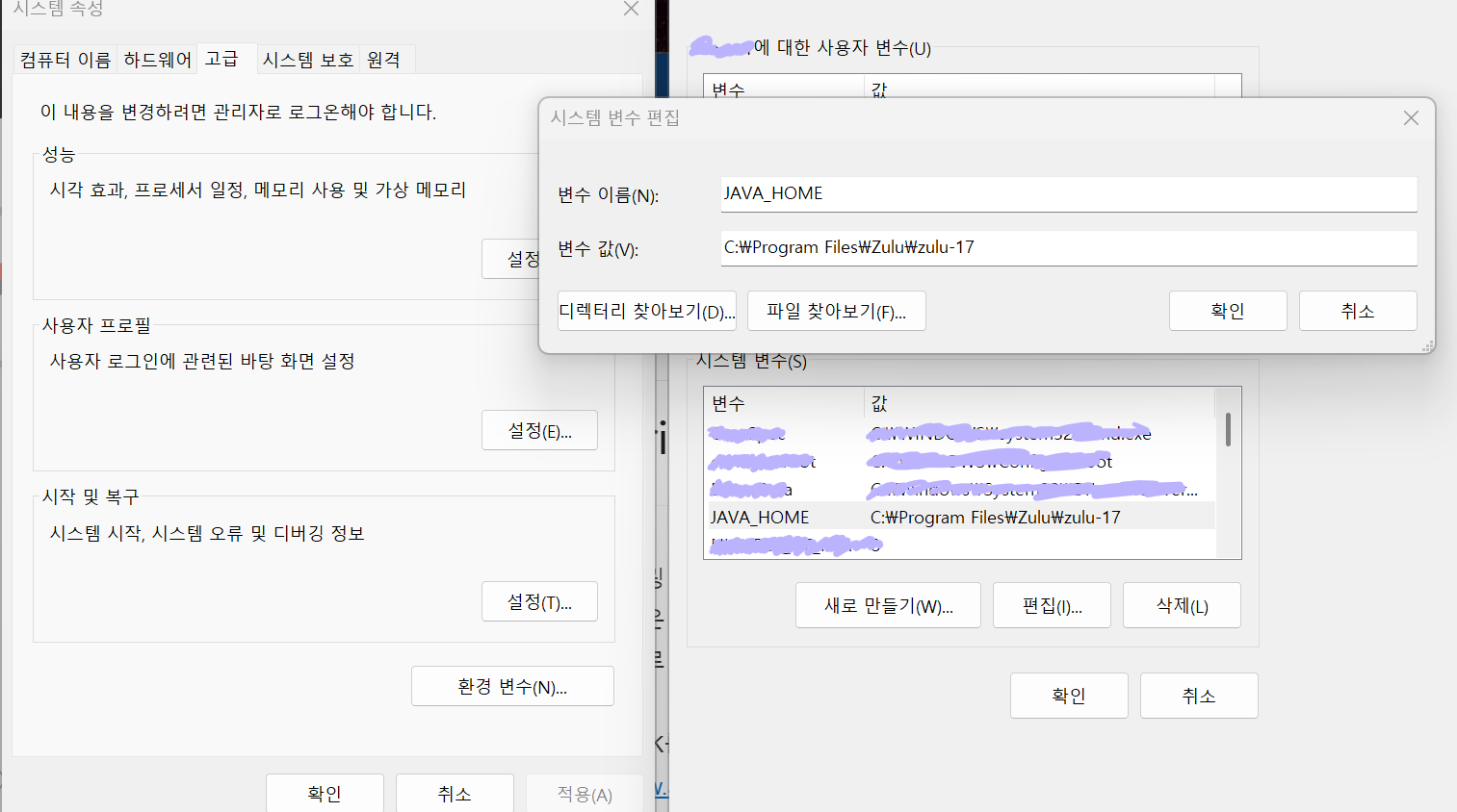 시스템 환경 변수 편집이 나옵니다C:\Program Files\Zulu\zulu-17 의 경로는 jdk설치경로입니다 각자의 설치 경로에 맞게 설정해 주세요.